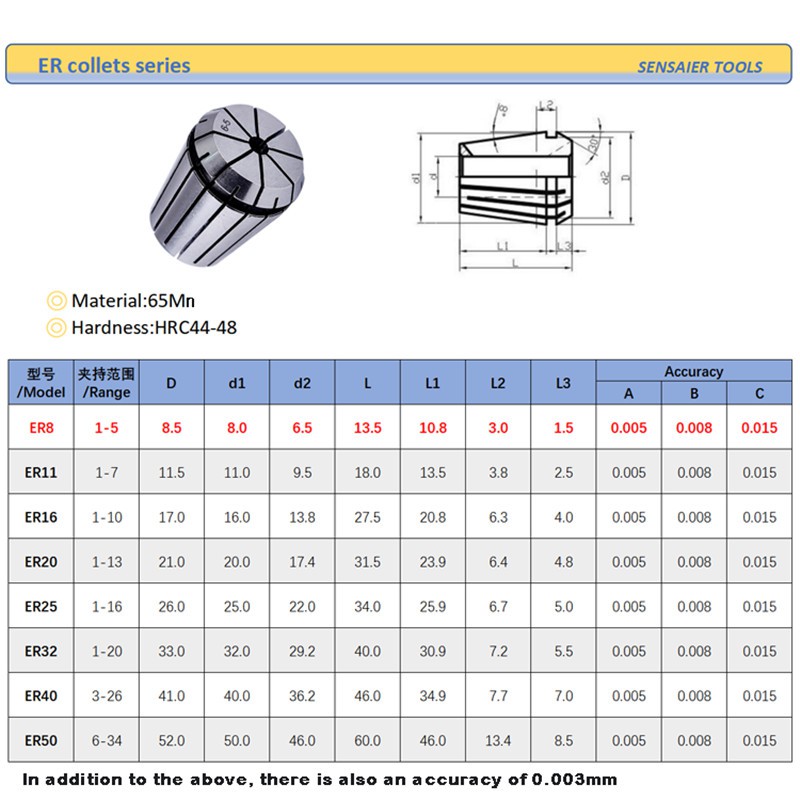 Milling machine collet, 65Mn material, high elasticity, high tensile strength, high fatigue strength, prolong the service life of the spring, improve the quality of the spring collet. High clamping force and wide clamping range. Accuracy is suitable for most processing needs, cost-effective.